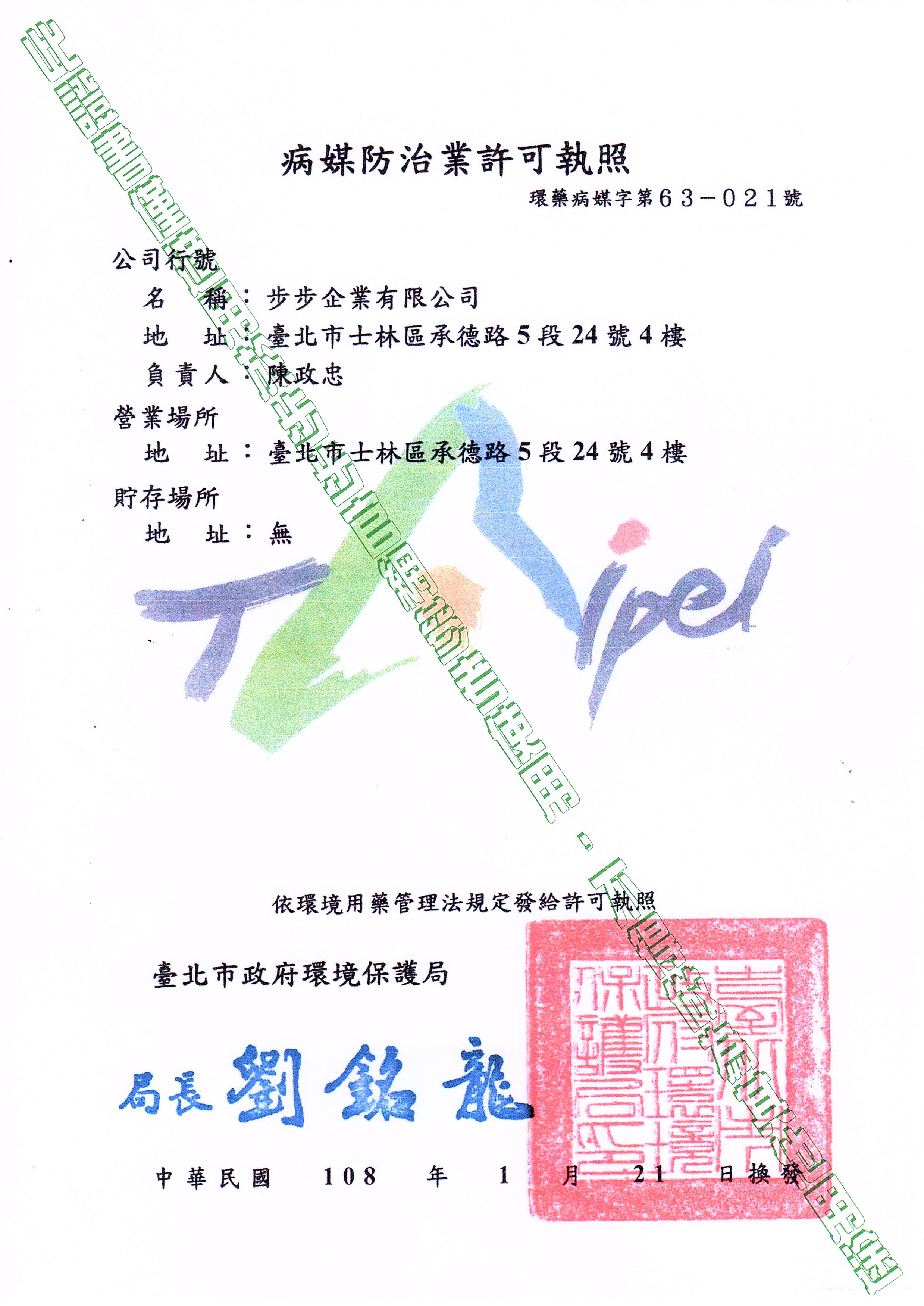 步步所使用之藥劑均通過歐美或台灣環保署許可之藥劑,均採用安全等級高之國家級合格藥品,僅對害蟲類有效。
