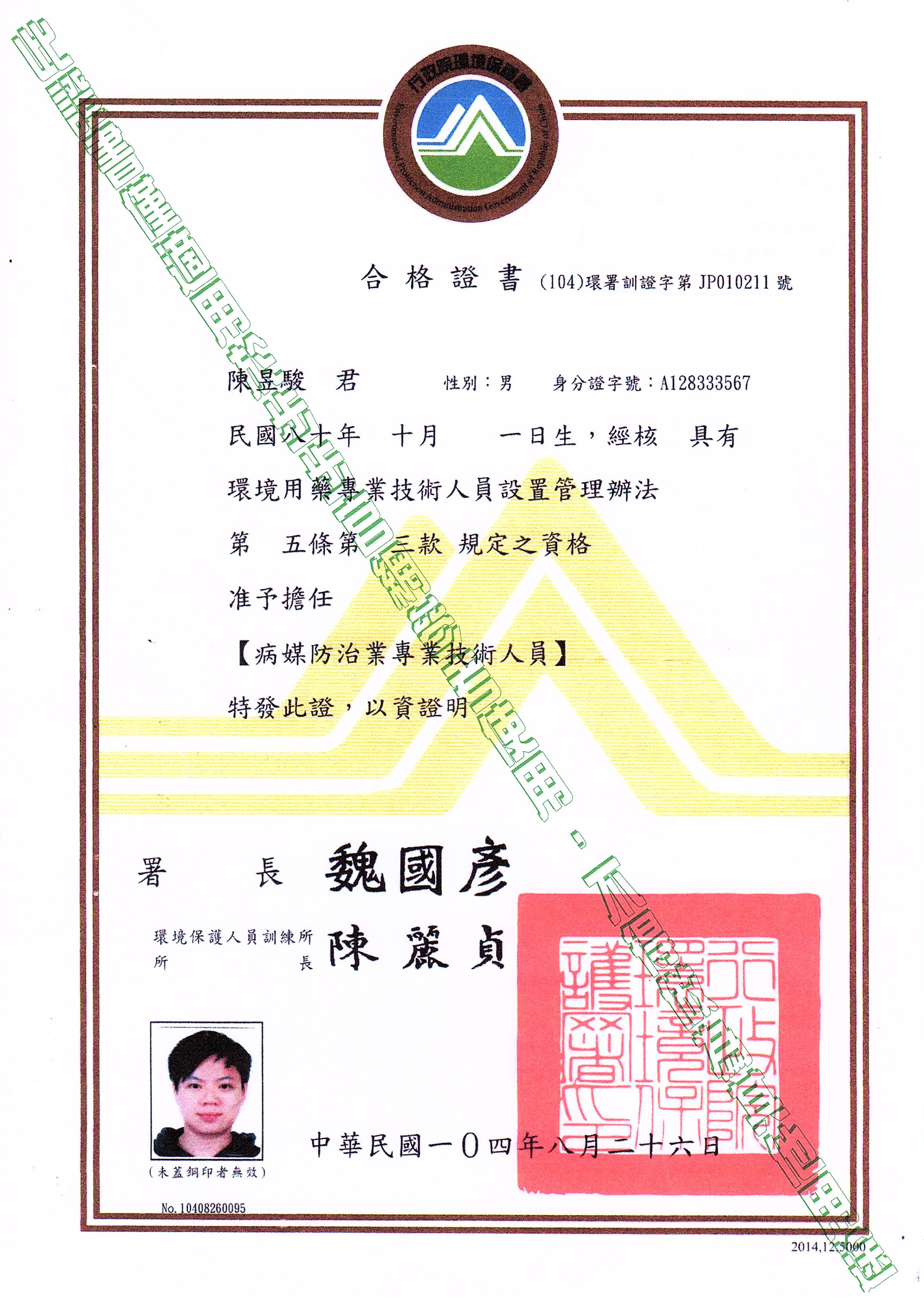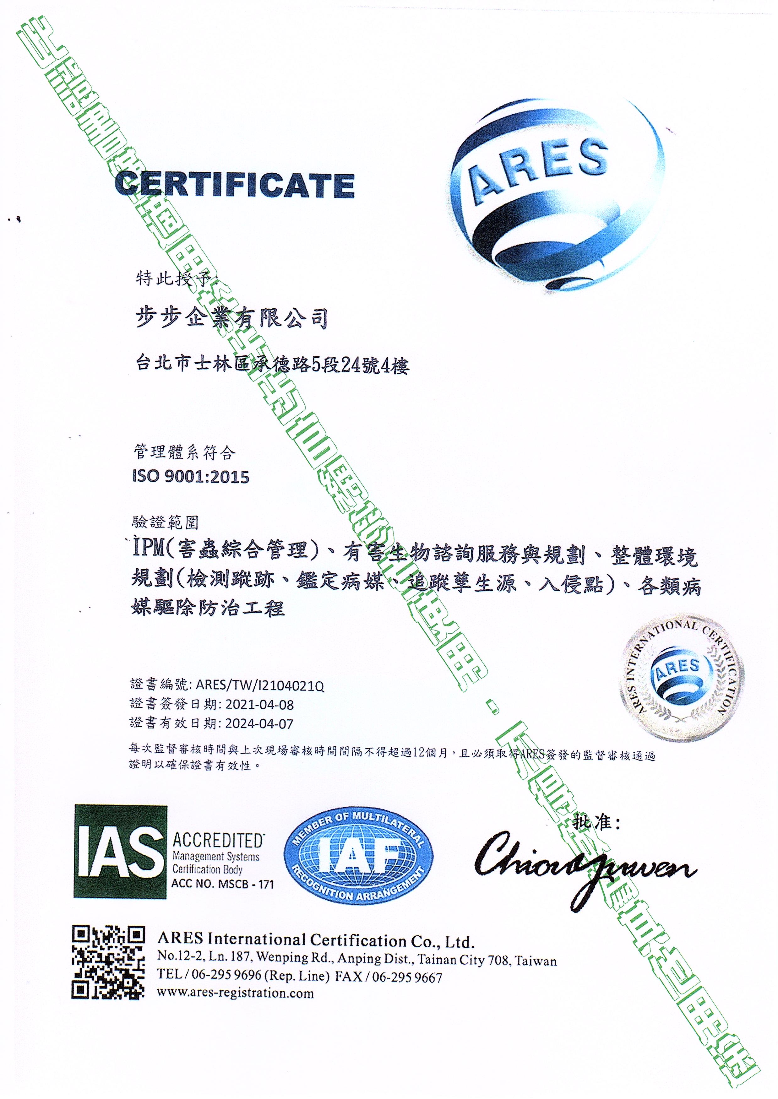 合格優良的除蟲企業 / 通過ISO9001品質管理系統證