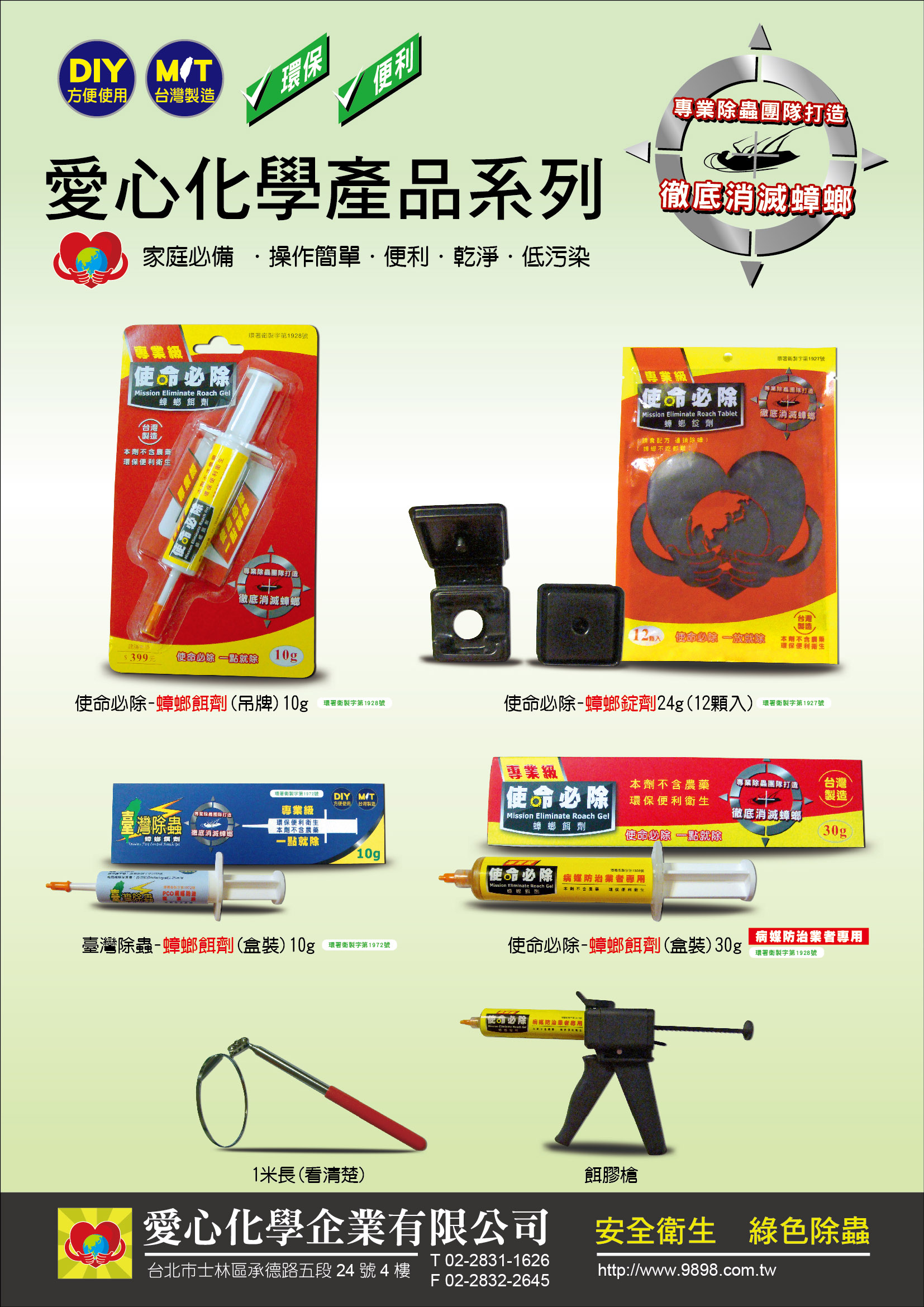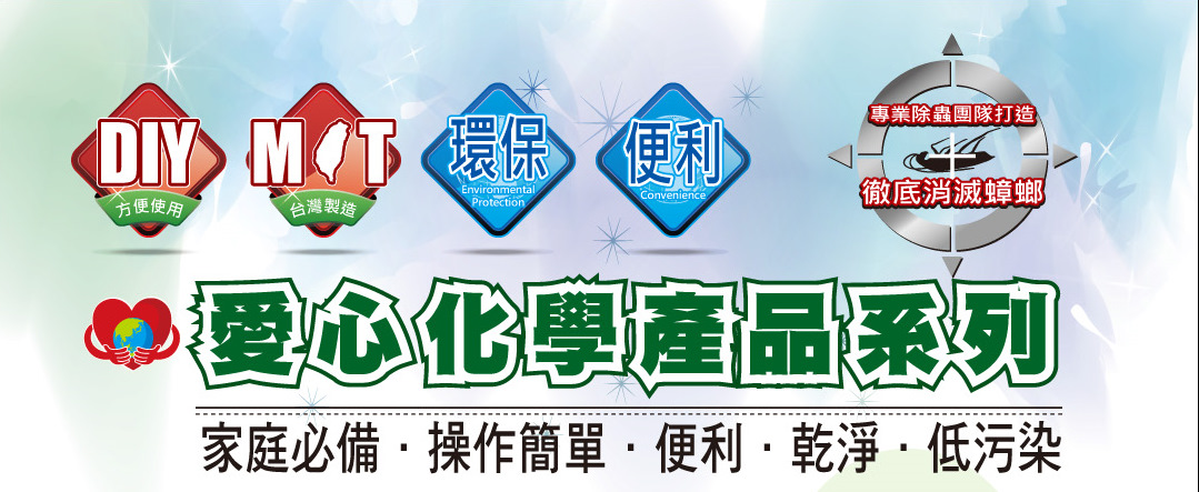 「愛心化學企業」具有專業防治室內外各式害蟲的除蟲製藥背景,本公司在台灣創立於1998年,公司的創始目的基於從事防治各式害蟲、除蟲經驗數十年,有感於市面上多種除蟲藥劑含有大量危害周遭環境成份。為了回饋於我們共同生活的這片大地上,因此創立愛心化學並積極於研發可有效消除害蟲,並避免對環境的傷害,降低化學污染的藥劑。