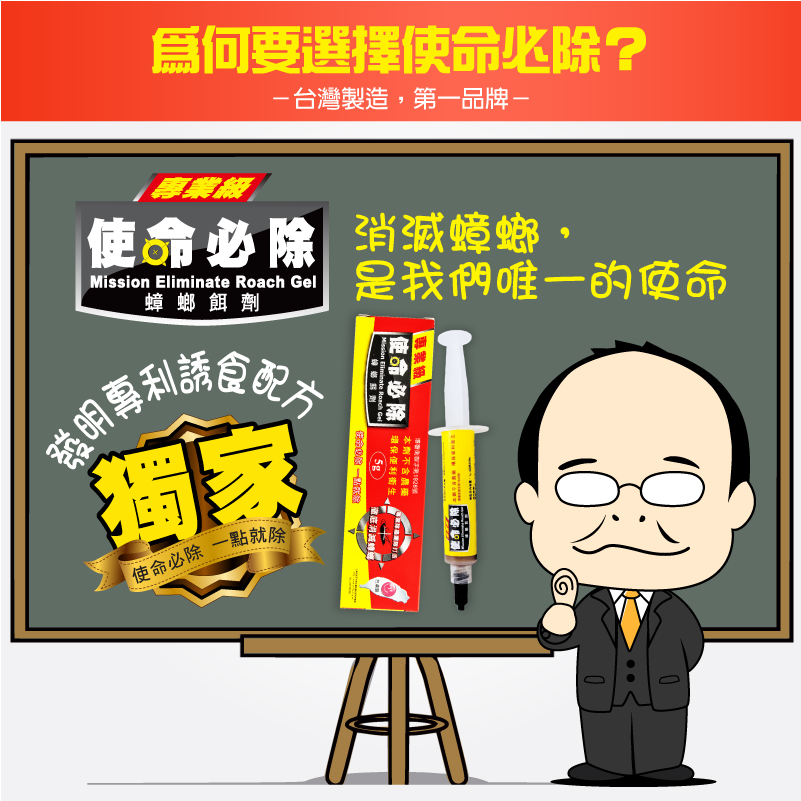 陳理事長從事除蟲消毒30多年,研發出專業等級滅蟑技術的蟑螂餌劑與餌錠,除了在吸引蟑螂吃食的誘引性擁有台灣發明專利,還針對台灣家庭環境與餐飲環境的蟑螂擁有極高的循環除蟑性,家裡只要準備【使命必除】蟑螂餌劑與餌錠,就不用再擔心蟑螂問題了。