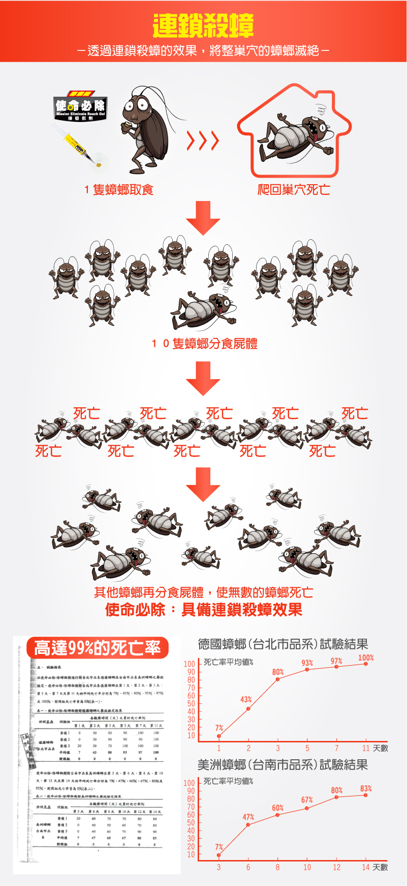 最終其他蟑螂也會因為吃了【使命必除】餌劑之後而死亡,並且不斷循環,直到家中蟑螂全部感染。