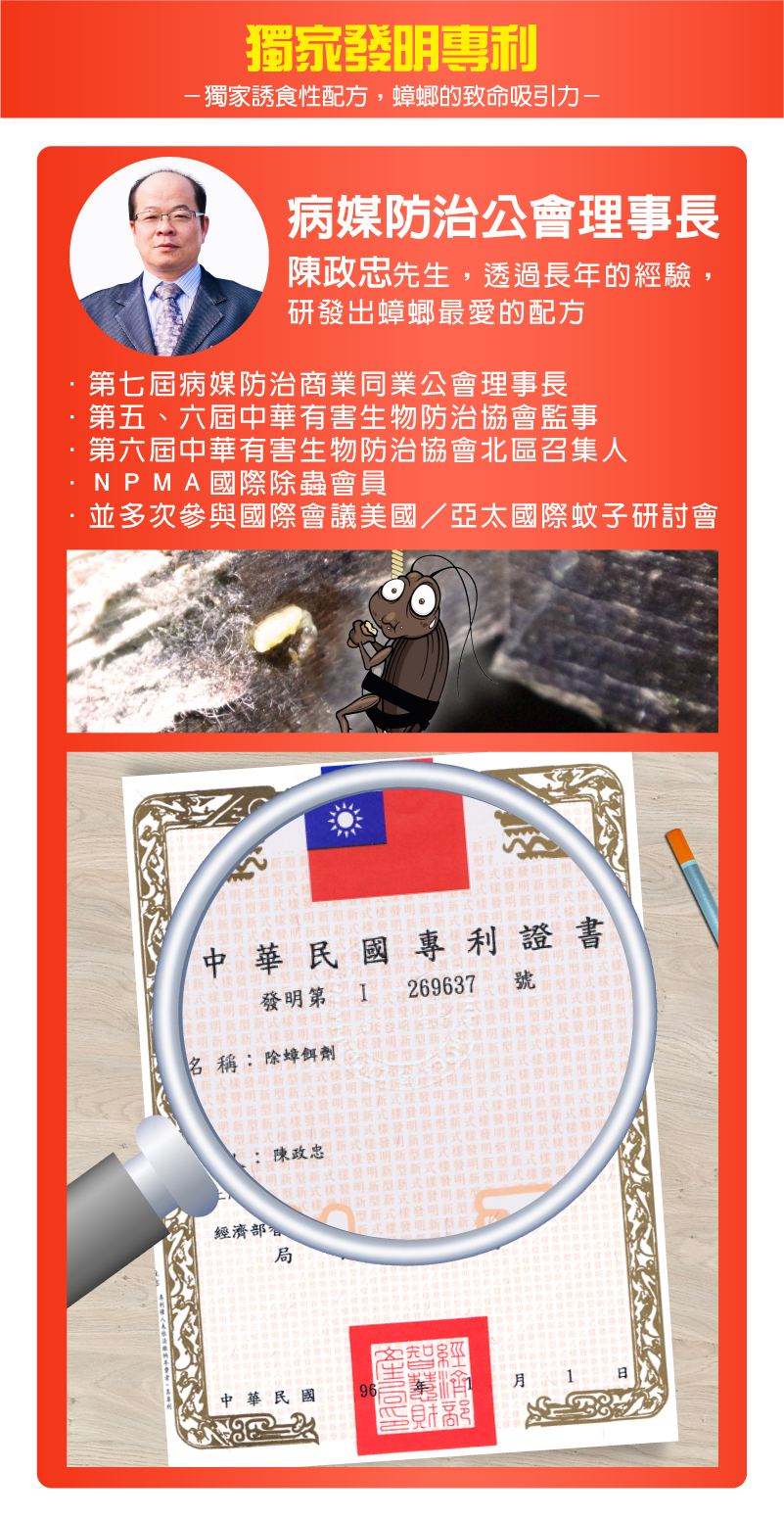 除蟑螂台灣業界獨家「誘引性」發明專利