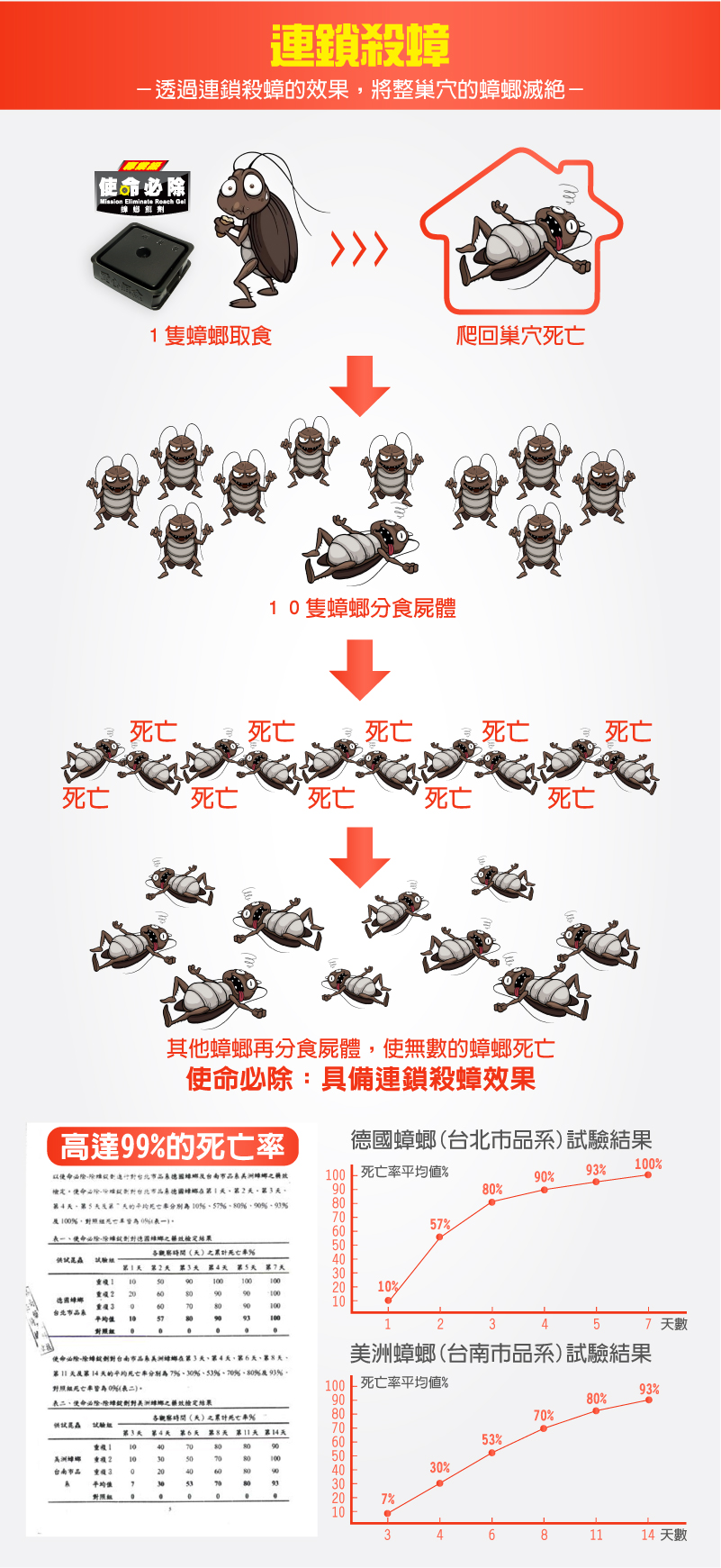最終其他蟑螂也會因為吃了【使命必除】餌劑之後而死亡,並且不斷循環,直到家中蟑螂都被感染。