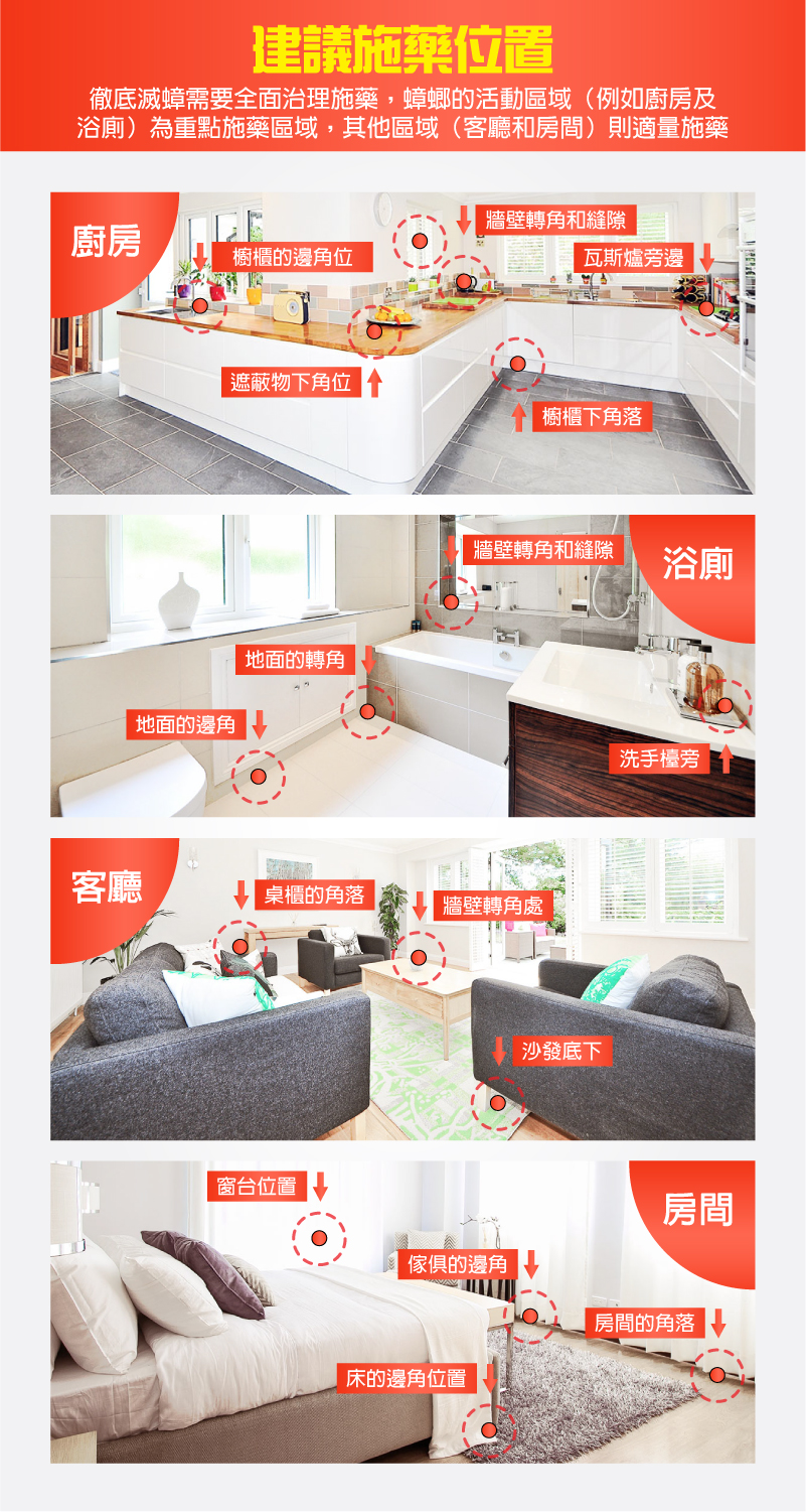 建議針對蟑螂密度較高的區域使用,以達到連鎖殺蟑的效果。適用範圍:餐廳、廚房、流理台角落、冰箱下、抽屜、工作台、櫥櫃、置物架、儲藏櫃、儲物櫃、倉庫、茶水間、垃圾桶、廚餘桶邊等處所。