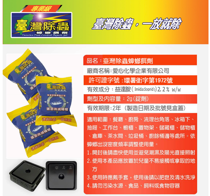 產品分類 一般除蟲藥品老鼠防治用品捕蟲燈防蟑落水頭精品消毒機具類 全部 一般除蟲藥品老鼠防治用品捕蟲燈防蟑落水頭精品消毒機具類 臺灣除蟲蟑螂餌錠 慢效型,可將連鎖殺蟑之骨牌效應有效發揮。 購買資訊:https://tw.shp.ee/NCKPCfa 回上頁